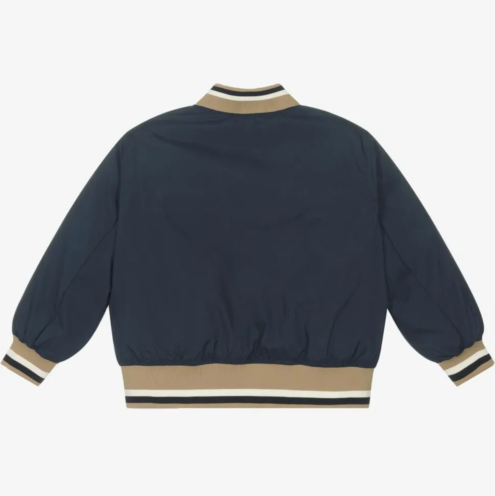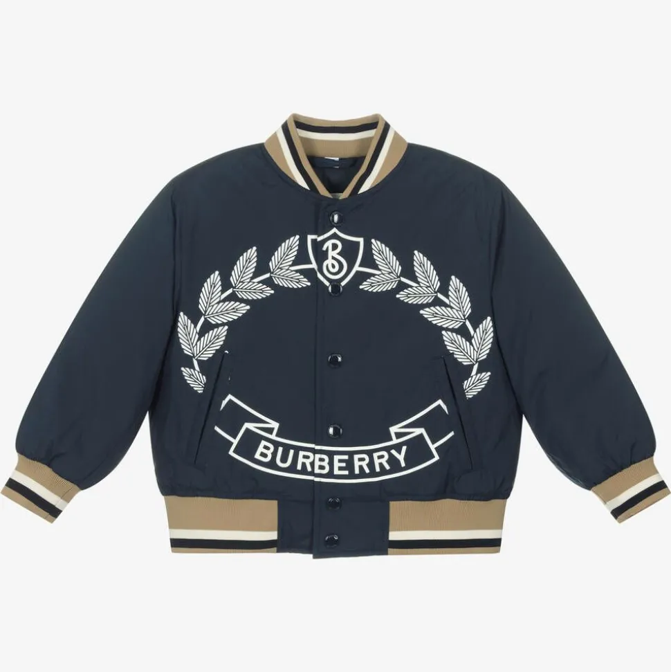 A navy blue bomber jacket for boys by luxury British brand Burberry, in a silky smooth fabric. Instantly recognisable, the designer's oak leaf crest logo is boldly printed in white, with ribbed trims in their signature archive beige. This jacket has a lightweight down-filling for warmth and fastens with poppers. The main material of this product is made with at least 70% recycled content.