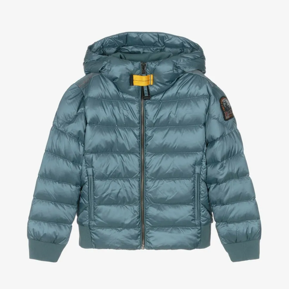 Cool light blue Mini-me hooded puffer jacket for boys by Parajumpers. Made in silky smooth fabric with a soft sheen, this down-padded jacket provide lightweight warmth for cool climates with windproof, water-repellent, breathable and down-proof qualities. It simply zips up and features bomber-style ribbed cuffs and hem, holes under the arm for ventilation, zipped external pockets and an internal mesh pocket with velcro for storing small essentials. The signature yellow velcro tape closure can be seen below the chin and the iconic logo patch is on one sleeve. This garment is made with 20% recycled fabric.