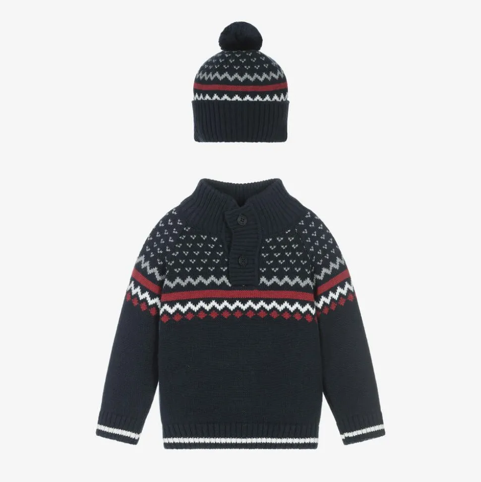 Navy blue sweater and hat set for younger boys from Dr. Kid, knitted in a soft, warm blend of cotton and wool. Ideal for the cooler months, this comfortable top has a charming Fair Isle pattern in grey, red and white. It has a high neckline for an extra cosy feel and fastens with branded buttons. A matching hat with a turned-up brim and pom-pom on the top completes the look.