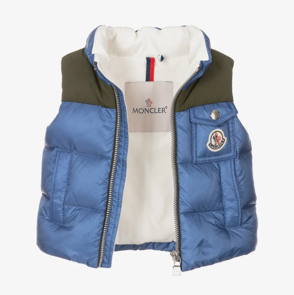 Blue gilet for little boys by luxury brand Moncler Enfant, made from silky smooth, micro rip-stop fabric with down padding for warmth without the weight. Designed with a khaki green panel on the shoulders, it has a cosy, detachable hood, lined in soft sherpa fleece and secured with branded poppers. There are popper-fastening front pockets to keep little hands warm and a soft jersey lining for comfort. It fastens with a front zip and has the designer's iconic felt logo patch on the small flap chest pocket for a distinctive finish.