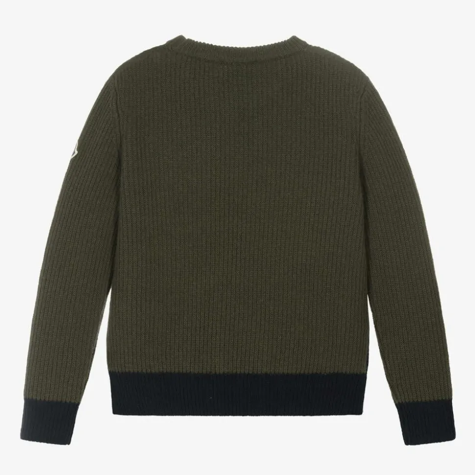 Navy blue and khaki green sweater for boys by luxury brand Moncler Enfant, knitted in soft virgin wool. The two-tone front has a khaki green intarsia logo across the chest and the designer's signature felted logo patch can be seen on one sleeve for a statement finish.
