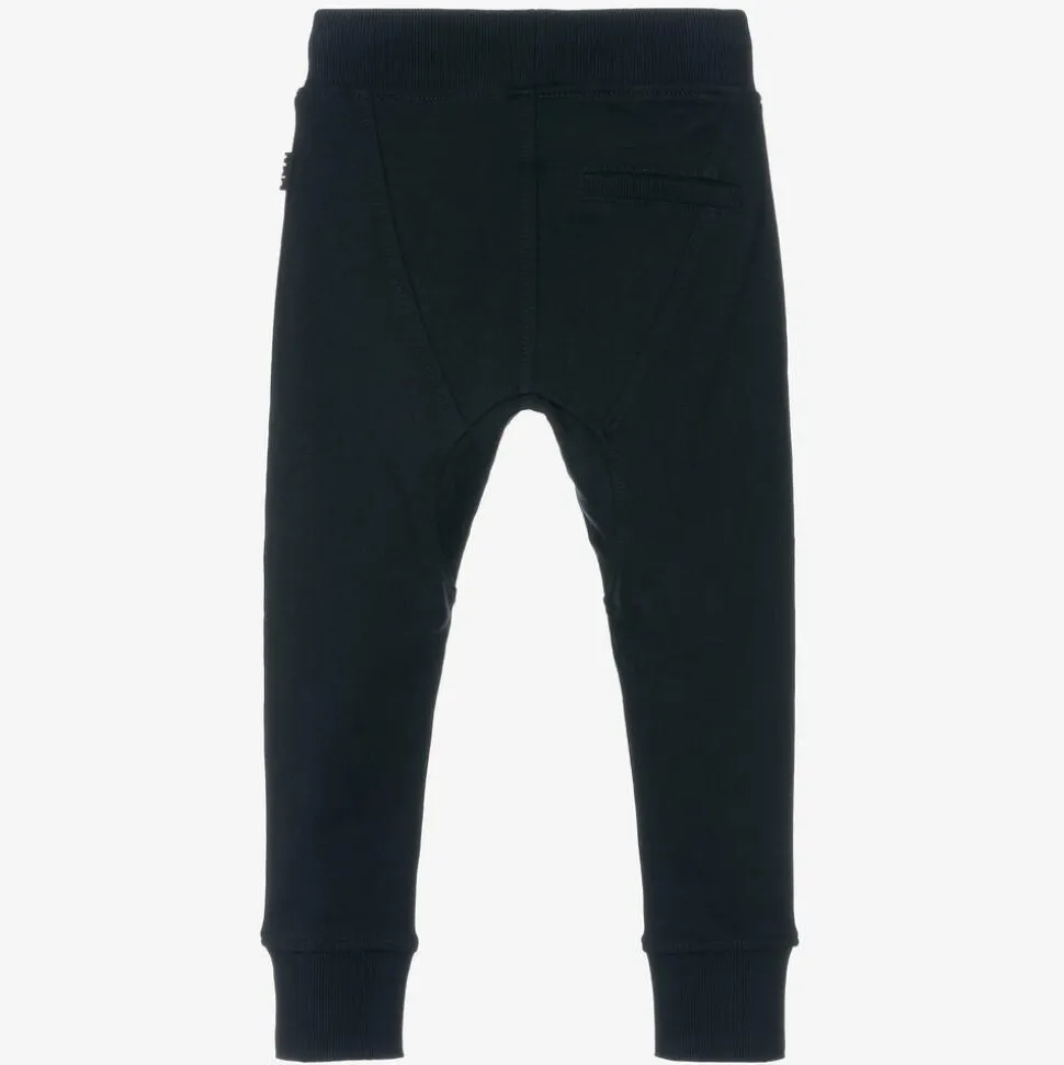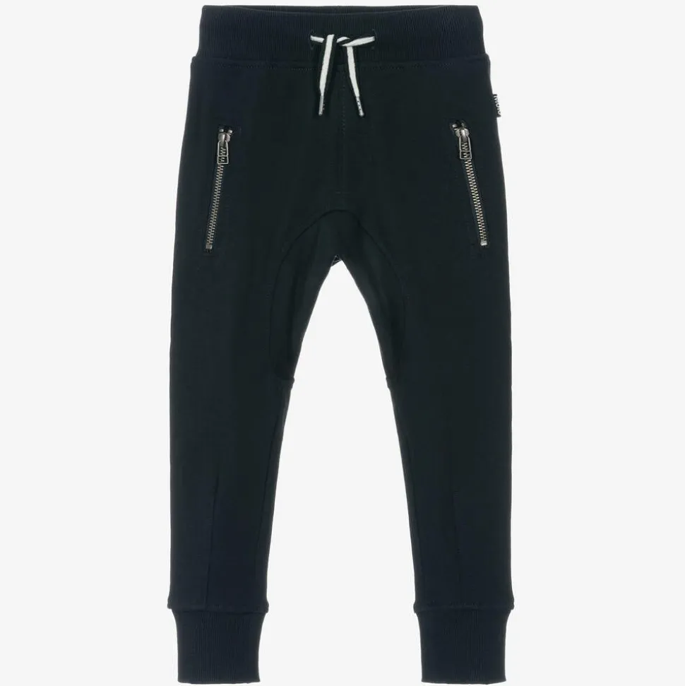 Casual navy blue joggers for boys by Molo, made in soft mid-weight organic cotton jersey. These joggers have a ribbed drawstring waist, zip-up front pockets and a faux pocket on the back for laid-back styling.