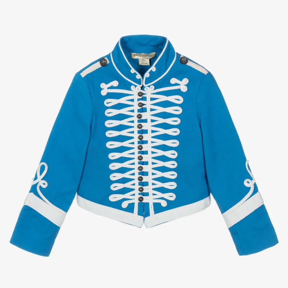 A blue twill military jacket for boys by Stella McCartney Kids, made and lined in soft organic cotton. Smart and traditional, this ornate jacket has faux crest buttons on the shoulders and white rope stitching for a heritage look. It secures neatly with round metal buttons on the front. The Stella McCartney fit can be quite small so choose a size up if you want room to grow.