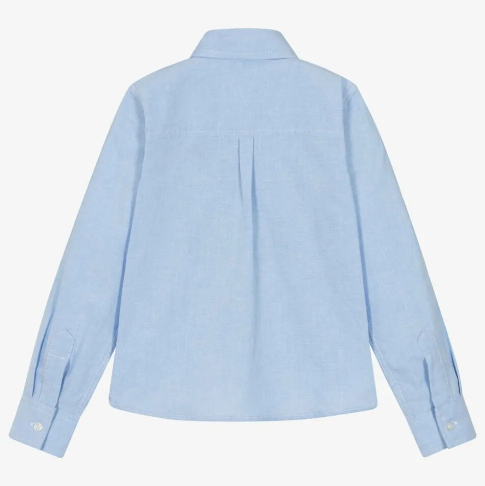 Smart blue shirt for boys by Dr. Kid, woven in soft Oxford cotton. It has a button-down collar, pearlescent button fastenings, and a tonal monogram logo embroidered on the chest pocket.