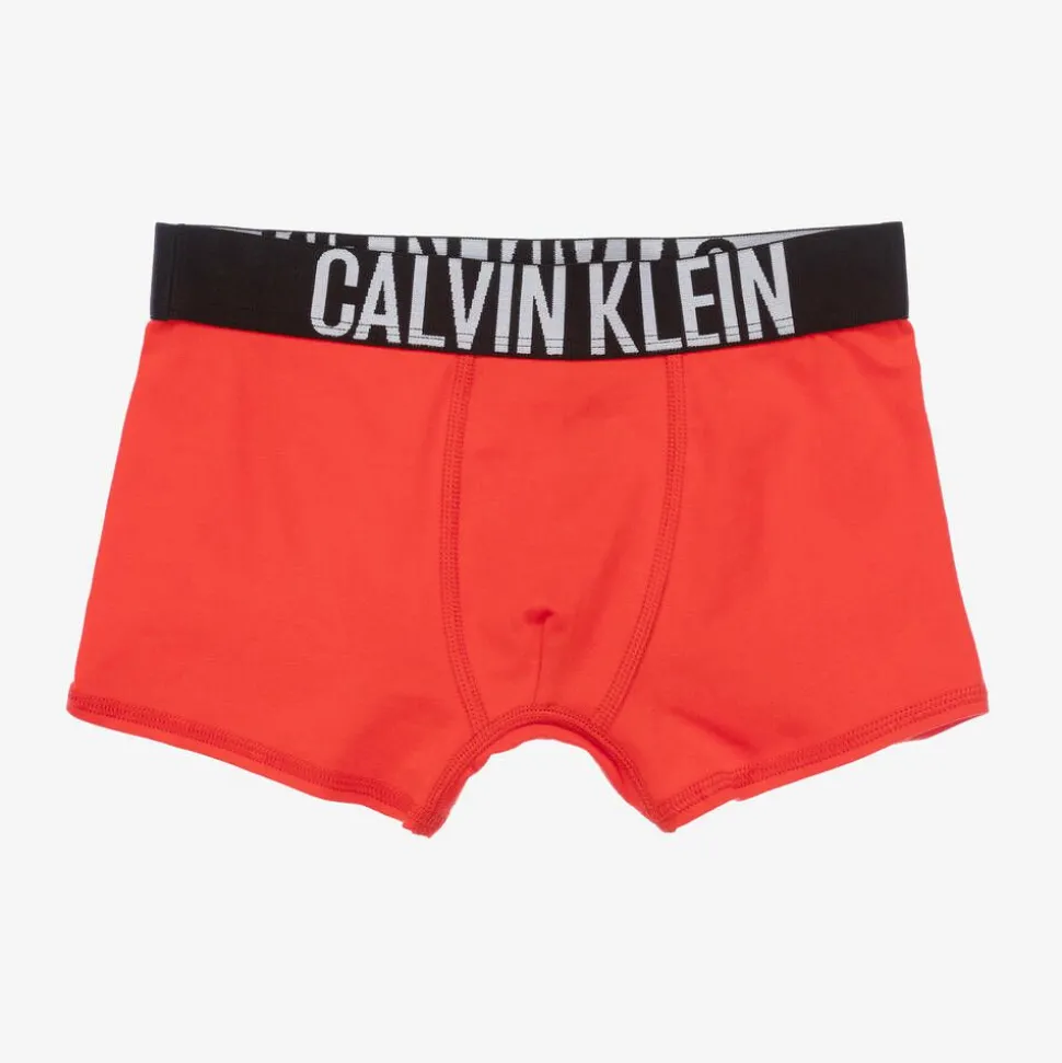 Pack of two boxer shorts for older boys by Calvin Klein, made from soft and stretchy cotton jersey. One is blue and the other is red and both pairs have an elasticated, logo-branded waistband for comfort and a distinctive finish.
