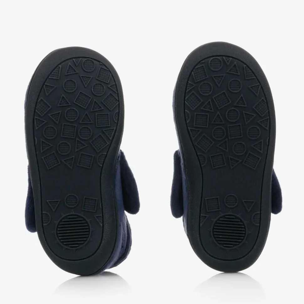 Boys navy blue slippers from Chipmunks, with a colourful embroidered rocket on the front. They are made in plush velour-feel fabric, with a padded memory foam inner sole. They have a non-slip rubber outer sole and fasten with velcro straps on the sides.