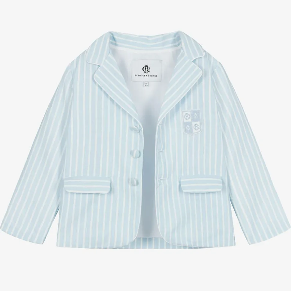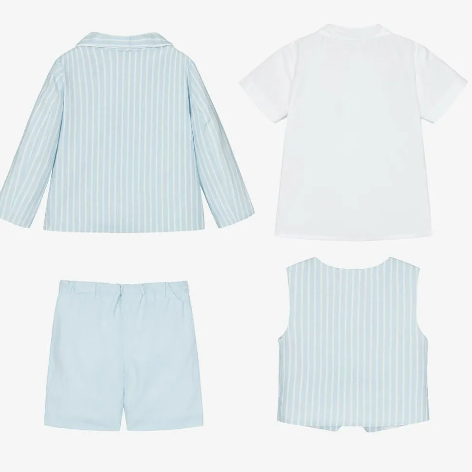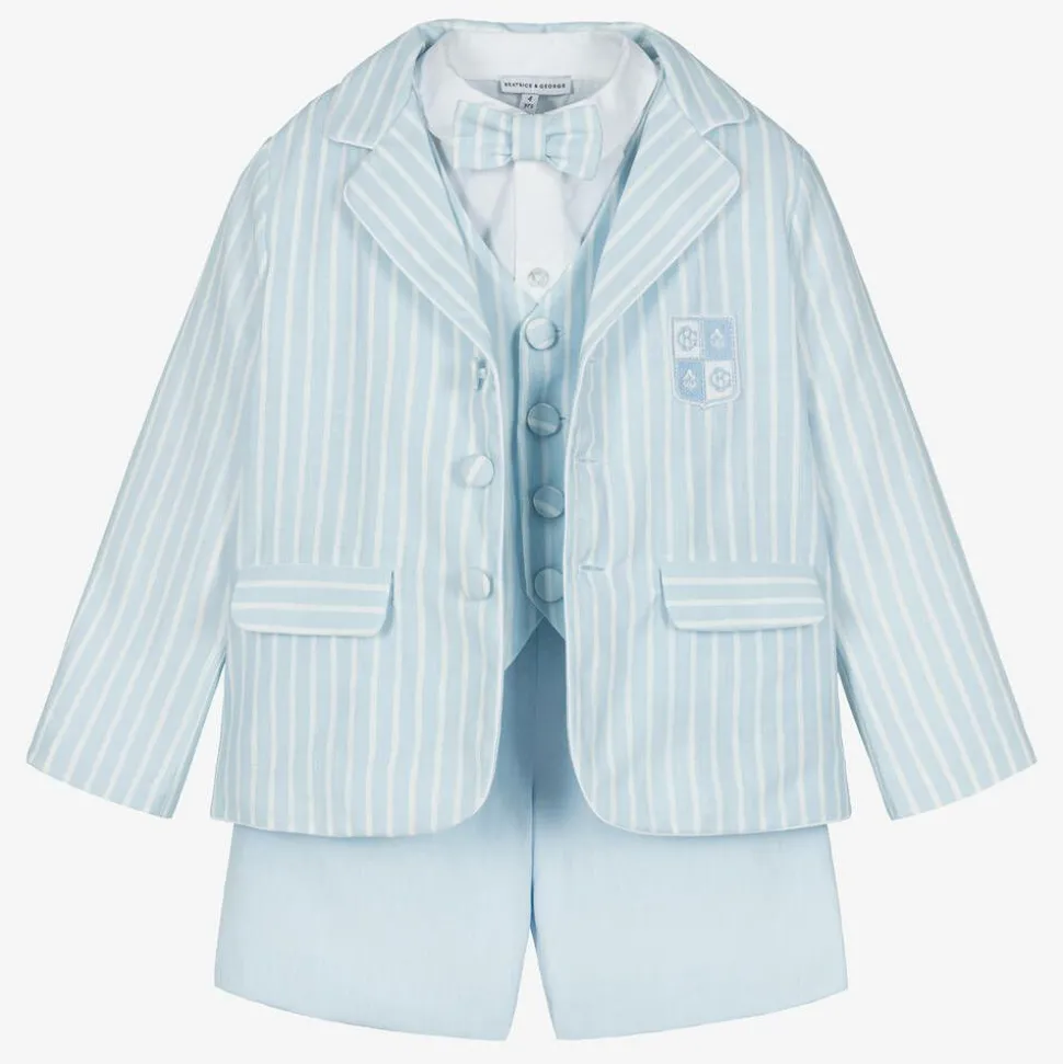 Smart pale blue five piece shorts suit for boys by British heritage brand Beatrice & George, exclusive to Childrensalon. Made in a cool cotton and linen blend, the jacket is boldly striped in white, with fabric-covered button fastenings, an embroidered crest logo badge and pockets on the front. It is lined in white satin for comfort and comes with a matching waistcoat. The lined, pale blue shorts have an adjustable waistband that is elasticated around the back for a good fit. A white cotton shirt and a detachable, striped bow tie complete the look.