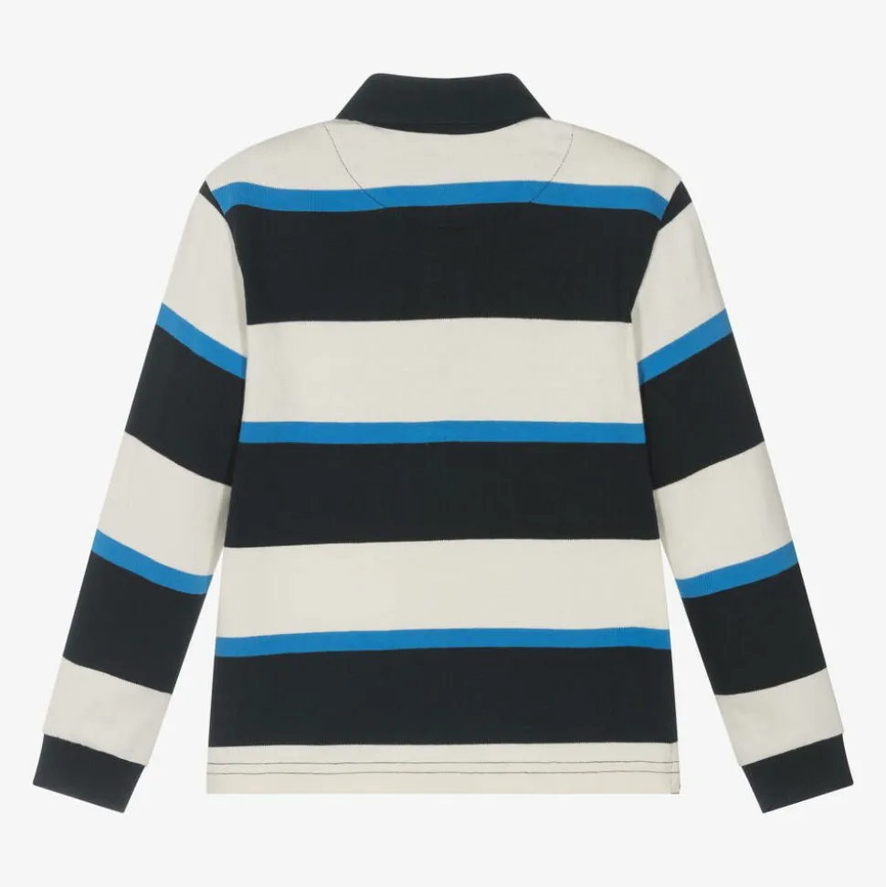 Blue rugby shirt for boys by Mayoral, with navy blue and ivory stripes. Long-sleeved, it is made in soft cotton jersey and has a woven collar. This casual top has a short button placket on the front, stretchy ribbed cuffs, and side vents for ease of movement.