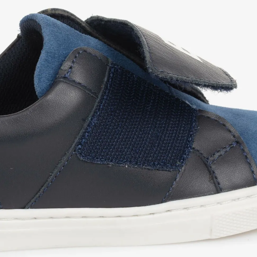 Casual blue trainers for boys by BOSS, made in soft suede and smooth leather for a contrast in texture. These designer trainers have a wide velcro strap across the foot, boldly branded with white logo lettering. They have a soft textile lining and a gently cushioned insole for added comfort. The non-slip rubber outer sole ensures good grip underfoot.