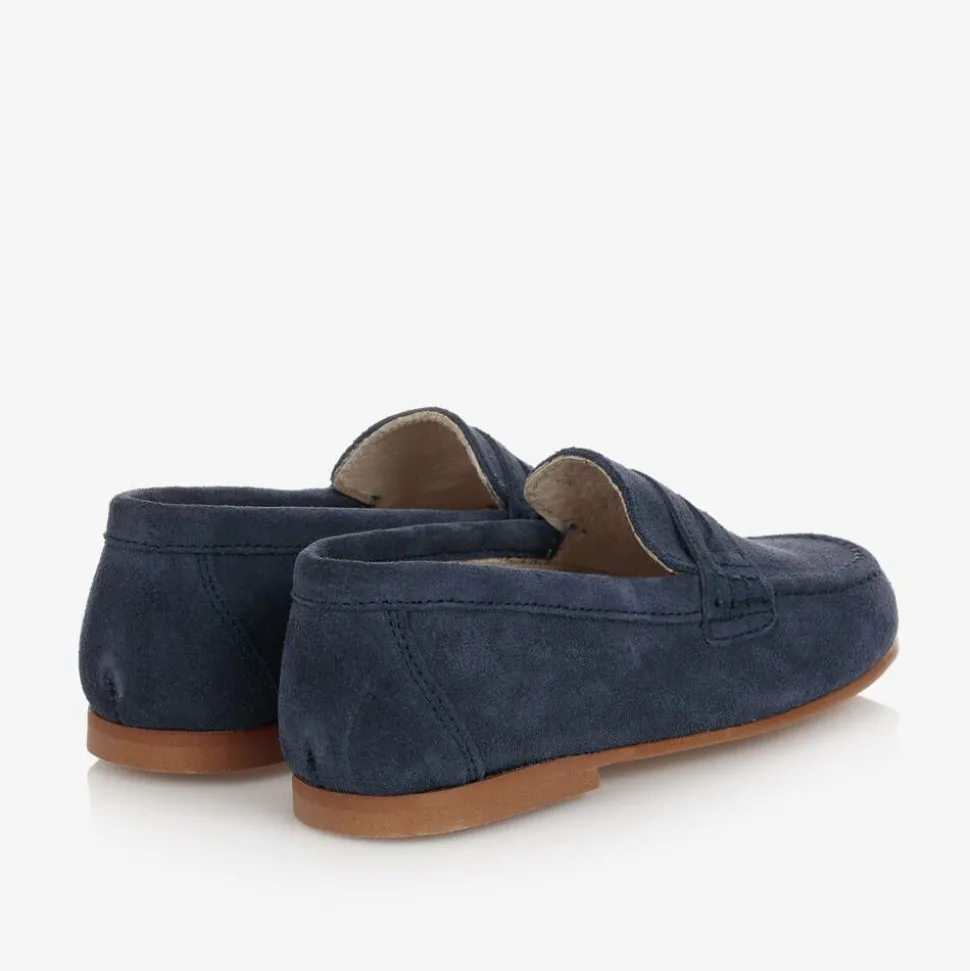 Exclusive to Childrensalon, boys blue suede leather shoes from Children's Classics, in a classic loafer style. These slip-on shoes have soft leather lining with a cushioned insole and a sturdy, non-slip rubber sole.