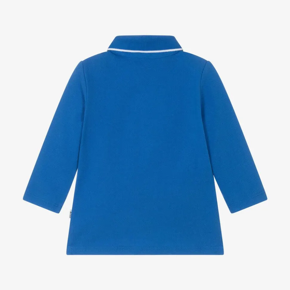 Bright blue long-sleeved polo shirt for little boys by BOSS, made in soft and comfortable cotton piqué. It has a classic ribbed collar with white trim, branded button fastenings and a split hem for ease of movement. Adding a distinctive designer touch, there is a rubberised white logo on the chest and a branded tab on the side seam.