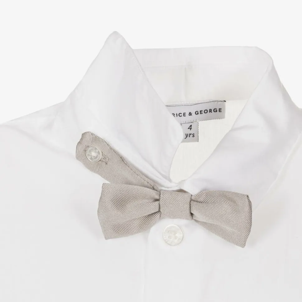 Exclusive to Childrensalon, a gorgeous special occasion suit for boys by British heritage brand Beatrice & George. Made in lustrous, soft bronze satin twill, the slightly fitted jacket has useful front pockets, a faux chest pocket and covered button fastenings. For comfort, it is lined in cotton and styled with a back vent for ease of movement. The matching trousers have slanted front pockets, an adjustable waistband for an ideal fit and a partial satin lining. A white cotton shirt completes the look, with a button-fastening, satin bow tie for a smart finish.