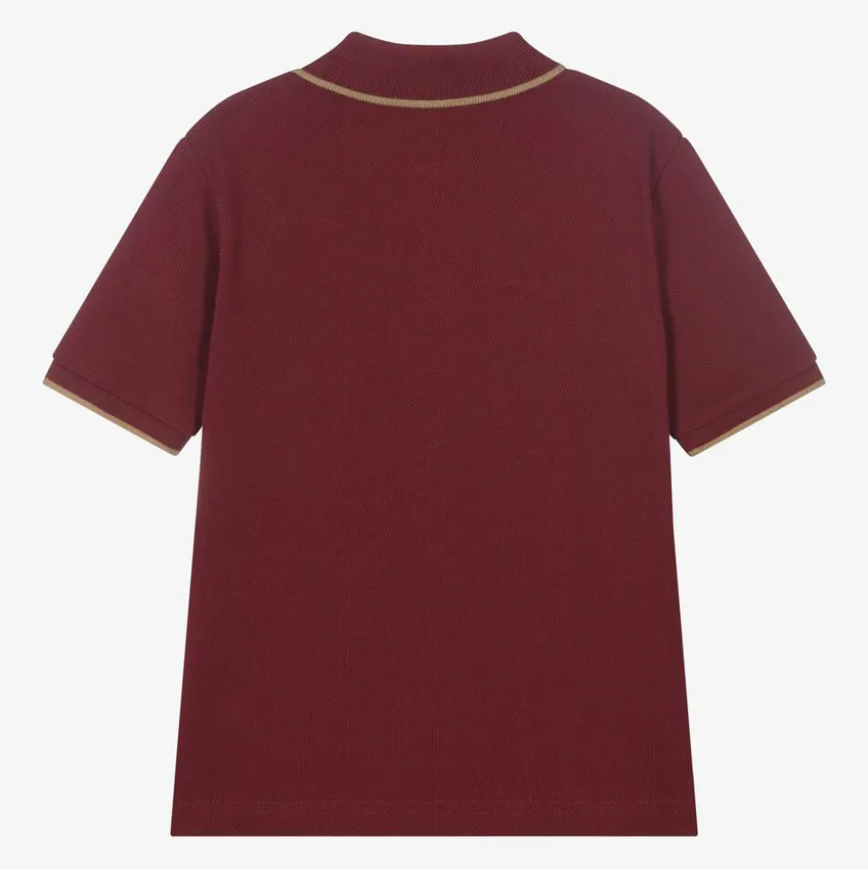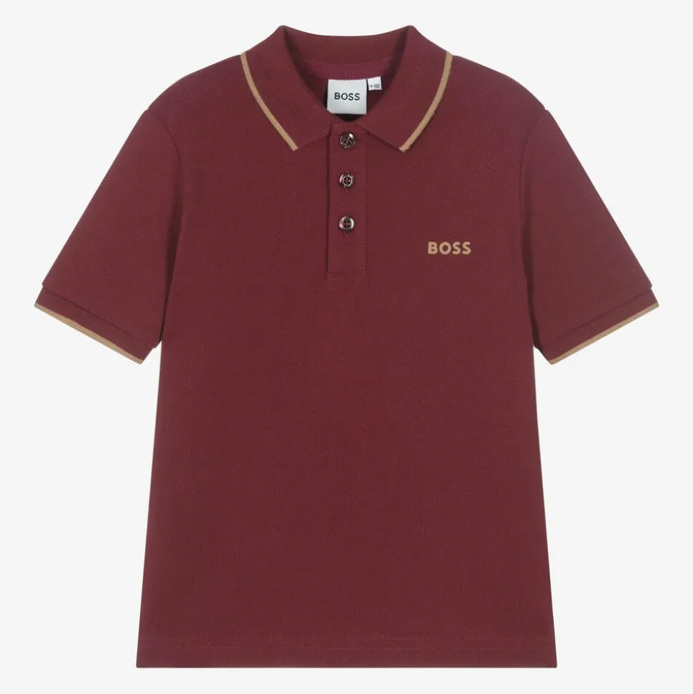 A burgundy red cotton Mini-me polo shirt for boys by BOSS, with a beige logo print on the chest. Made in comfortable piqué, this classic style has beige tipping on the ribbed collar and cuffs. It fastens on the front with branded buttons and has vented sides for easier movement.