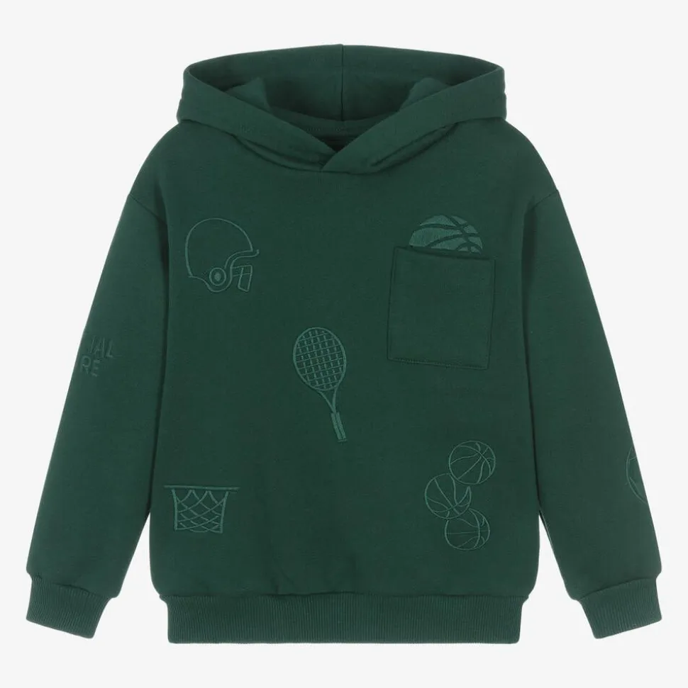 A dark green hoodie for boys by Mayoral, with a sports-themed embroidered design. Casual and comfortable, it is made in soft mid-weight cotton-blend jersey, with a cosy fleecy inside and ribbed trims.