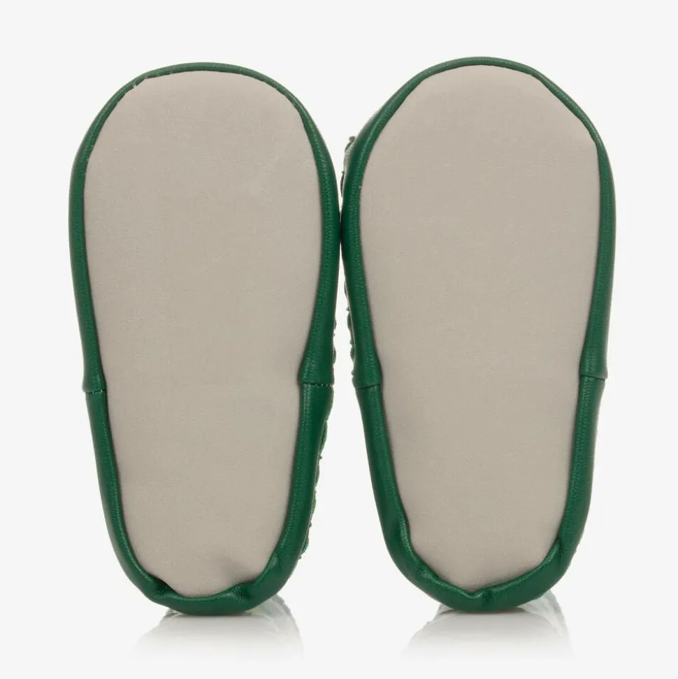 Green moccasin slipper socks for younger boys from Powell Craft. Great for keeping feet cosy, the base is made from non-slip faux leather and the cotton-rich socks are striped in green and white, with a cute dinosaur motif.