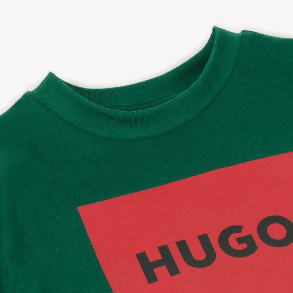 Green short-sleeved T-shirt for boys by HUGO, made in soft organic cotton jersey. Cool and casual, this crew neck top has a bold, red box logo graphic on the front for a branded look.