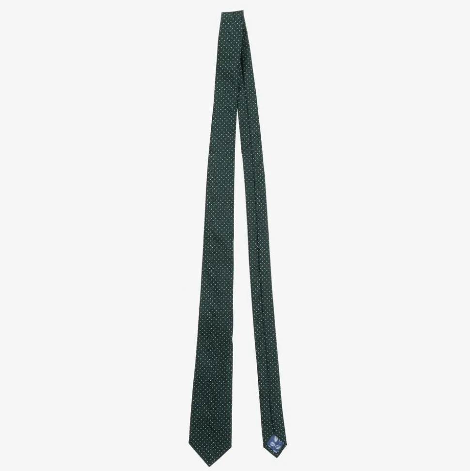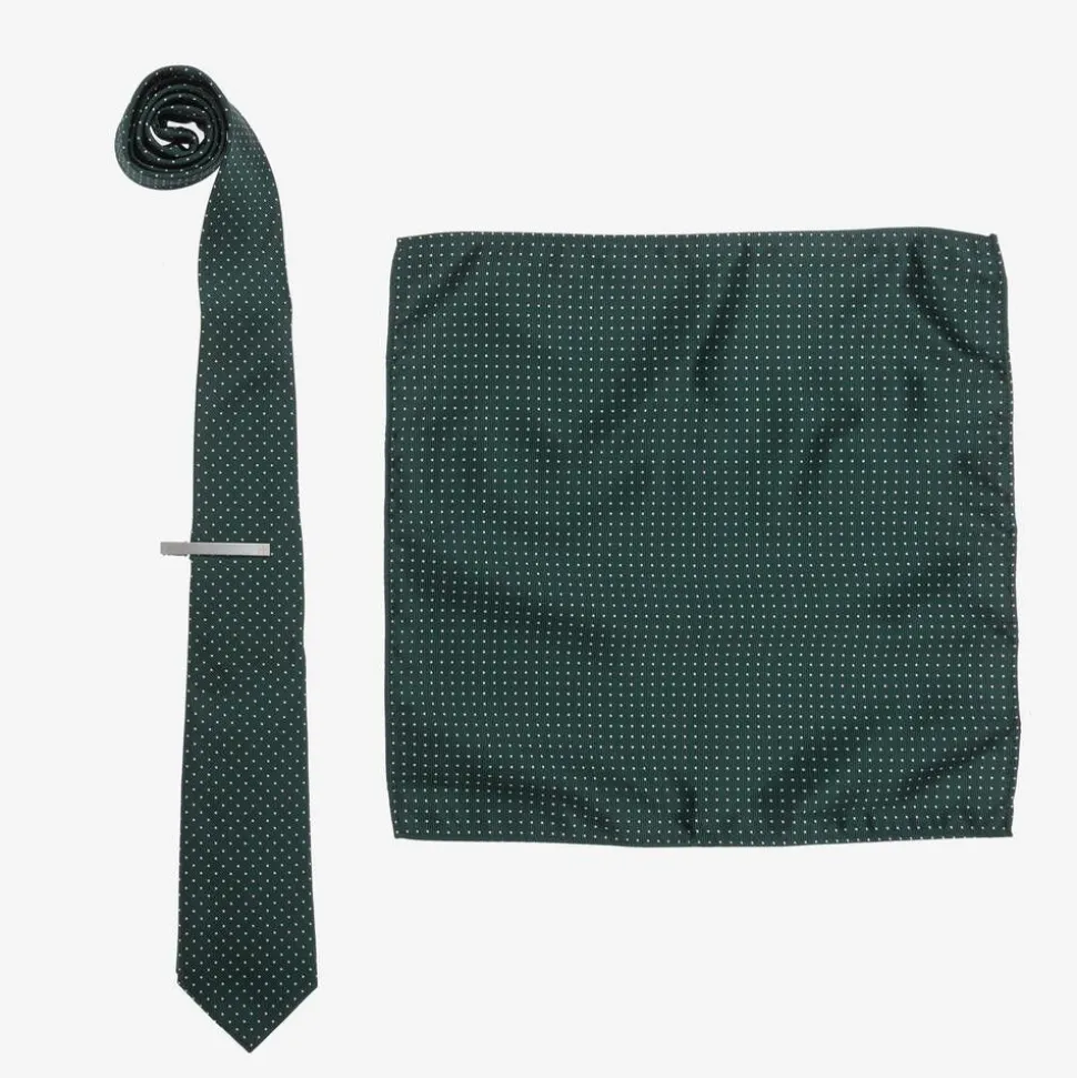 From House of Cavani, a green satin tie set for boys. Patterned with intricate polka dots, this smart tie comes with a matching pocket square for a complete look and a silver clip pin to hold it securely in place.
