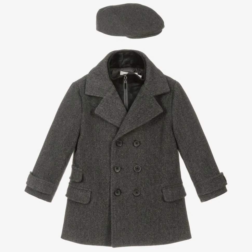 Dark grey coat and cap set for boys by Beau KiD. Super soft and comfortable to wear, it has a smart collar and double-breasted button closures on the front for a timeless silhouette. To lock in warmth, it has an interior zip fastening with super soft velour trims for extra comfort. There are useful front flap pockets and classic button detailing on the cuffs. It comes with a matching flat cap with a small stiff brim in the front to complete a traditional look.