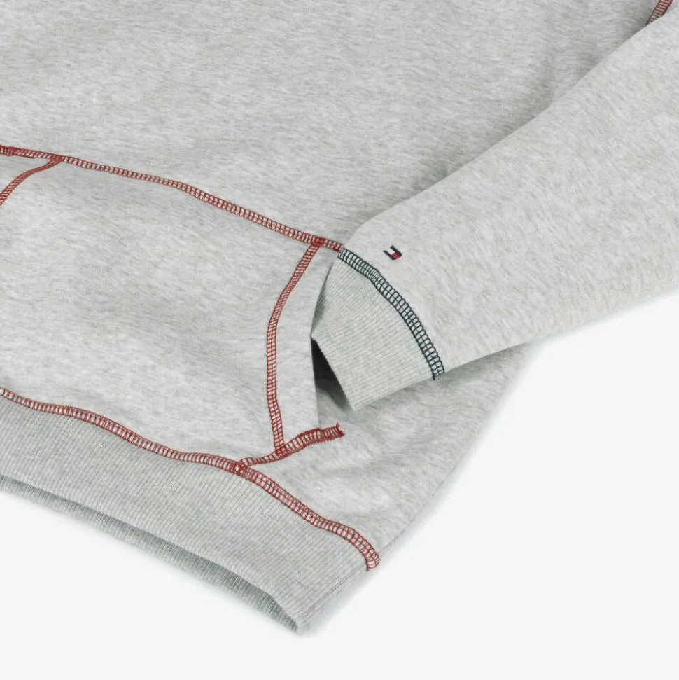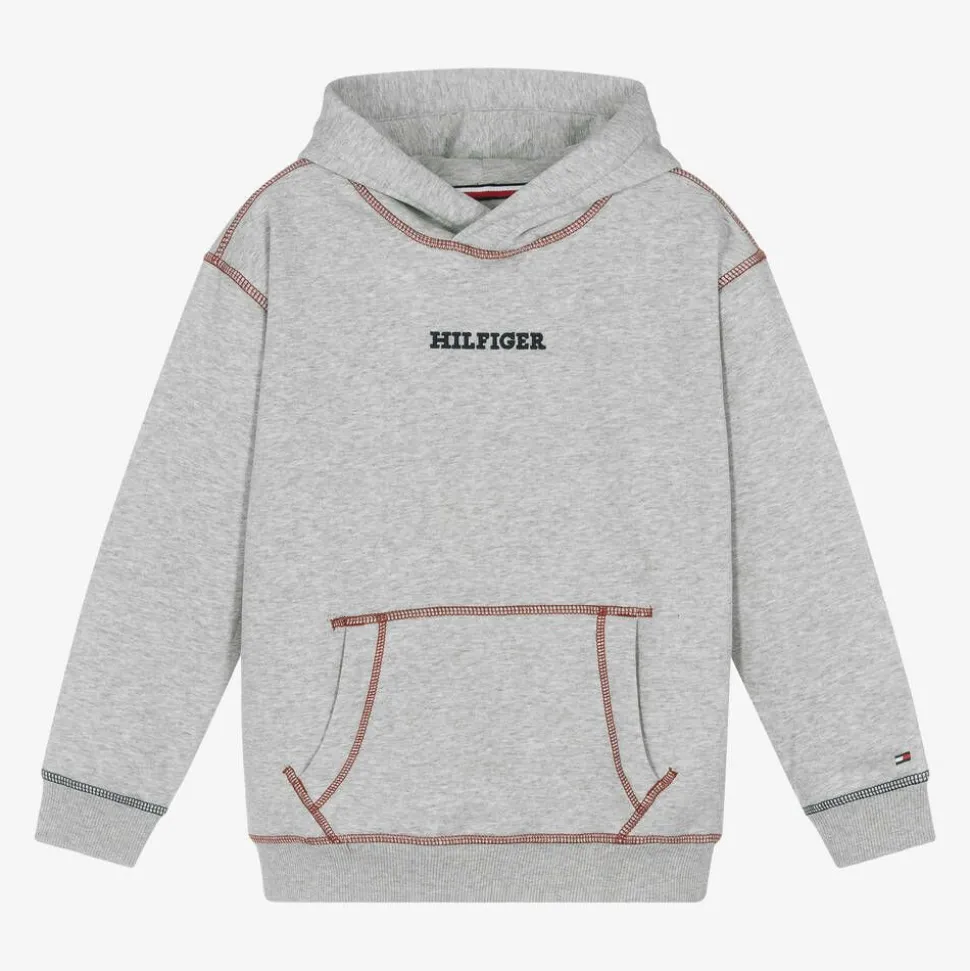 Grey marl cotton blend hoodie for boys by American brand Tommy Hilfiger, with red and navy blue contrast stitch detailing. Made in comfortable jersey with a soft, fleecy inside, this casual top has the brand's monotype logo embroidered in navy blue across the chest. Signature flag logo embroidery can be seen on one sleeve and to complete the relaxed look, it has stretchy ribbed trims and a useful pouch pocket on the front.