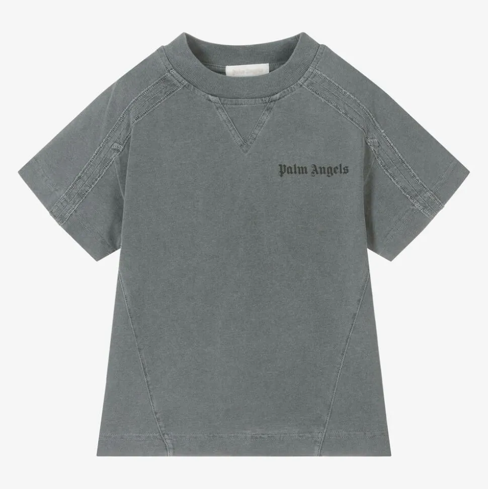 Cool grey cotton shaded T-shirt for boys by Italian brand Palm Angels. For instant brand recognition, there is a black Palm Angels logo printed on the front and a large, vertical logo on the back. Made in soft, comfortable jersey, it has a V-insert below the ribbed, crew neck, with overstitch detailing on the raglan sleeves and panels on the sides.
