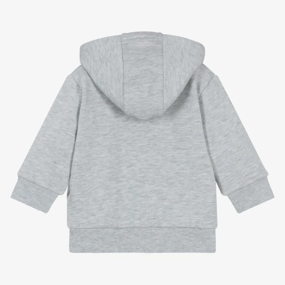Casual grey marl zip-up top for little boys by American brand Timberland, with the designer's signature tree logo printed on one side in brown and yellow. Ideal as a layering piece, it is made in comfortable cotton jersey with a warm, fleecy inside. It has a fixed hood and useful pouch pockets on the front, with cosy, ribbed trims on the long sleeves. The front zip fastening has a logo pull tab and a protective yellow chin guard.