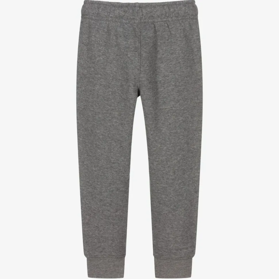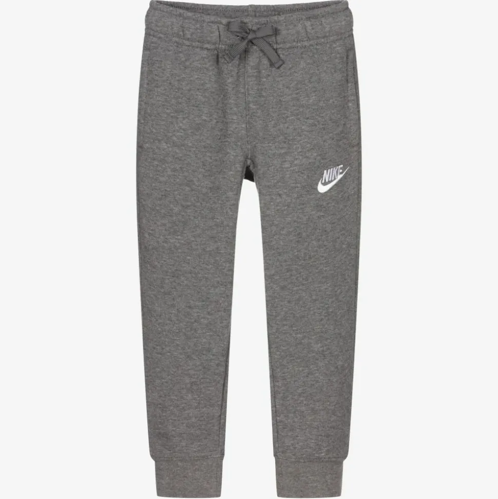 Boys grey joggers by sports brand, Nike. The soft cotton-blend jersey has a fleece feel, with a brushed fleece interior. They have an adjustable drawstring waist, white logo embroidery and side pockets.