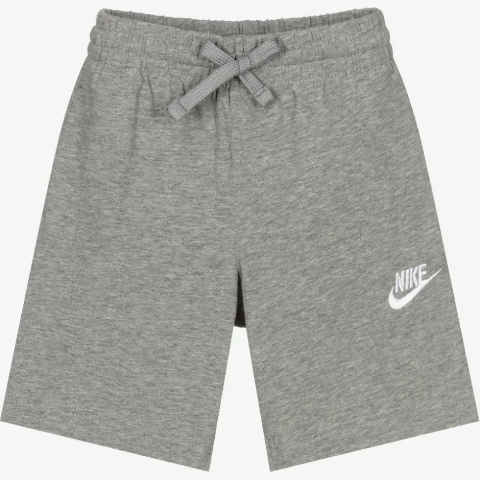 Boys grey cotton jersey shorts by sports brand, Nike. They have an adjustable drawstring waist and the brand's logo is embroidered in white on one leg. There are pockets at the sides and one on the back.