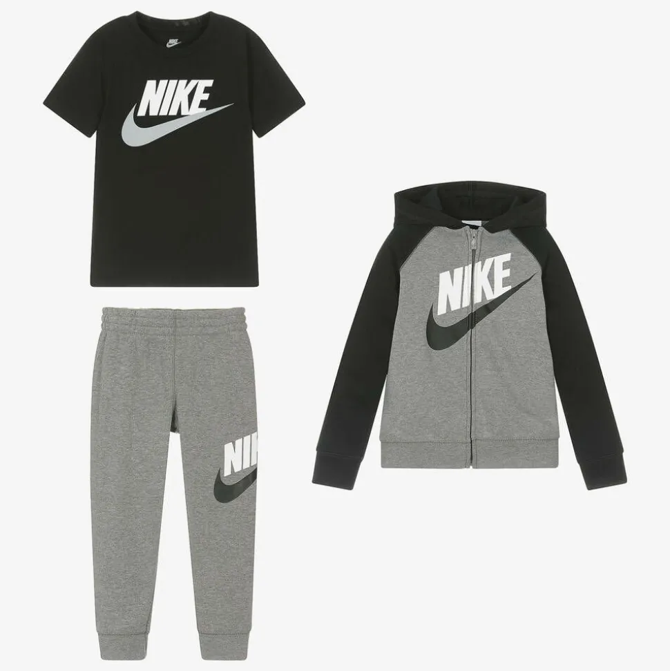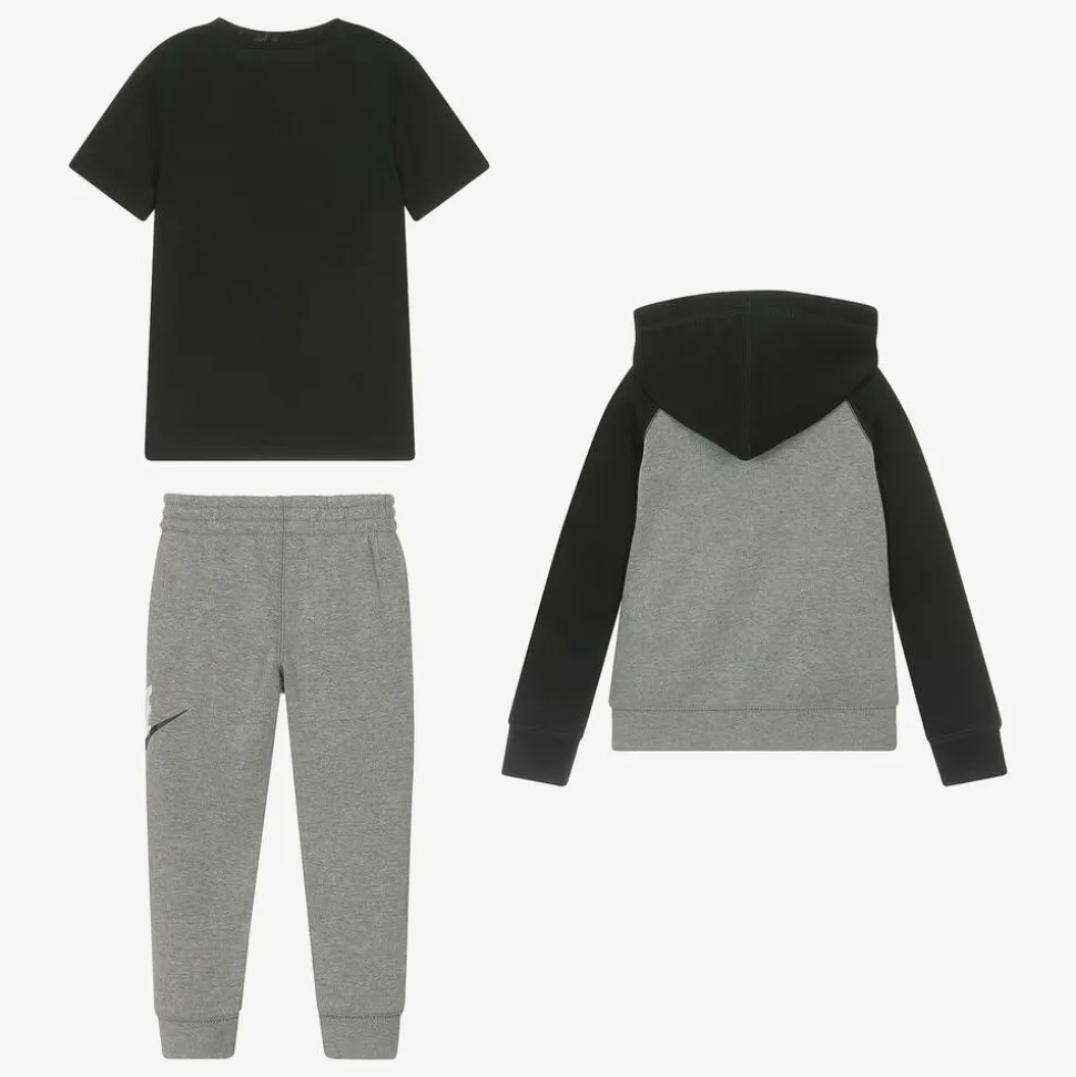 A grey marl and black tracksuit set for younger boys by Nike, made from a super soft cotton blend jersey. This comfortable outfit includes a coordinating zip-up hoodie, joggers and a black T-shirt printed with the iconic Swoosh logo for a sporty casual look.