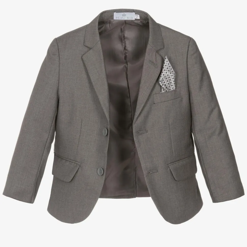Grey suit for boys by Beau KiD, made in a soft viscose blend with a silky satin lining. With an additional inside pocket, the single-breasted jacket has two flap pockets and a decorative buttonhole on the lapel to give the suit a more formal look. The matching trousers, fitted with an adjustable waist, are designed with belt loops and side pockets. To look extra smart, the suit can be worn with a matching waistcoat and a patterned tie that neatly complements the pocket square. Woven with a subtle tonal pattern, the white shirt completes this occasion look.