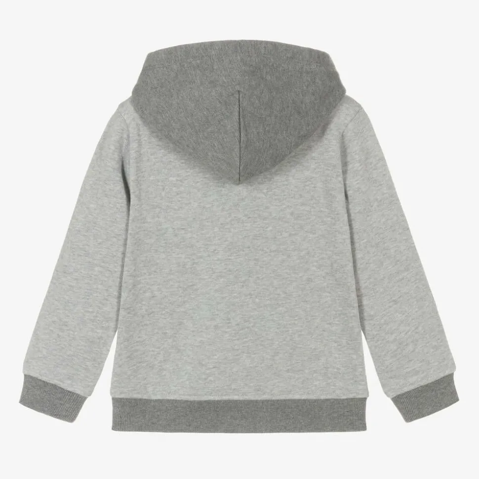 Ideal for relaxed days, this grey marl cotton hoodie for boys is by Tommy Hilfiger. It is made in soft, comfortable jersey, with a lined hood and ribbed trims in contrasting grey. An appliqué varsity logo is on the front in red and ivory, whilst the signature flag logo is embroidered on one sleeve.