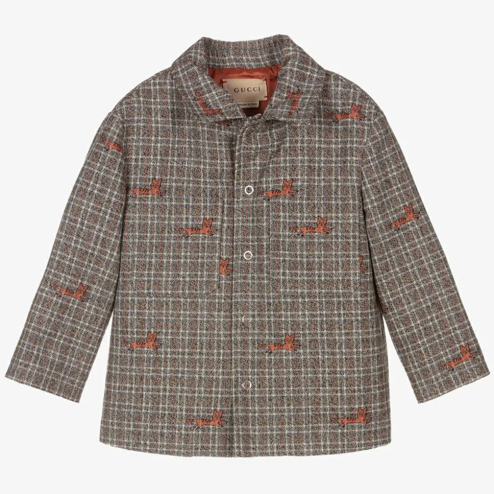 Little boys grey and orange check jacket by luxury brand Gucci, made in a lightweight wool blend. It has an adorable cat motif inspired by the House's menagerie, and the colour is reflected in the silky soft cupro lining. The jacket has popper fastenings, and patch pockets on the chest.