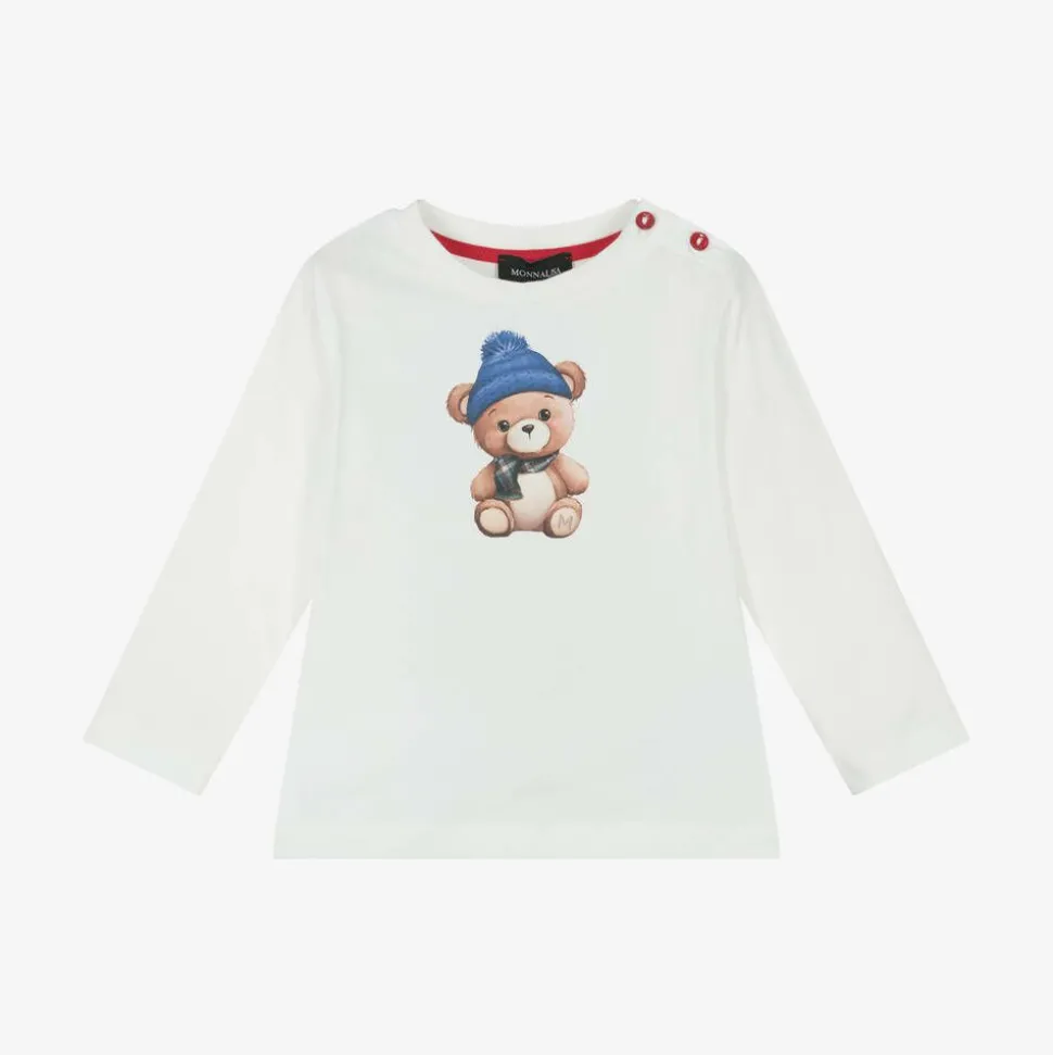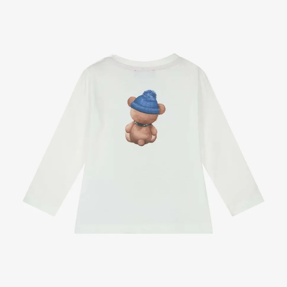 A long-sleeved cotton top for little boys by Italian brand Monnalisa. This ivory top has a cute bear print on the front and back, wearing a blue pom-pom hat and a checked scarf. It has a simple round neckline and red button fastenings on one shoulder.