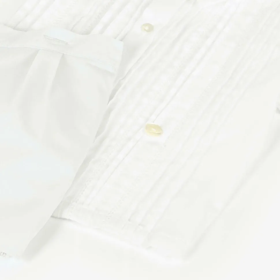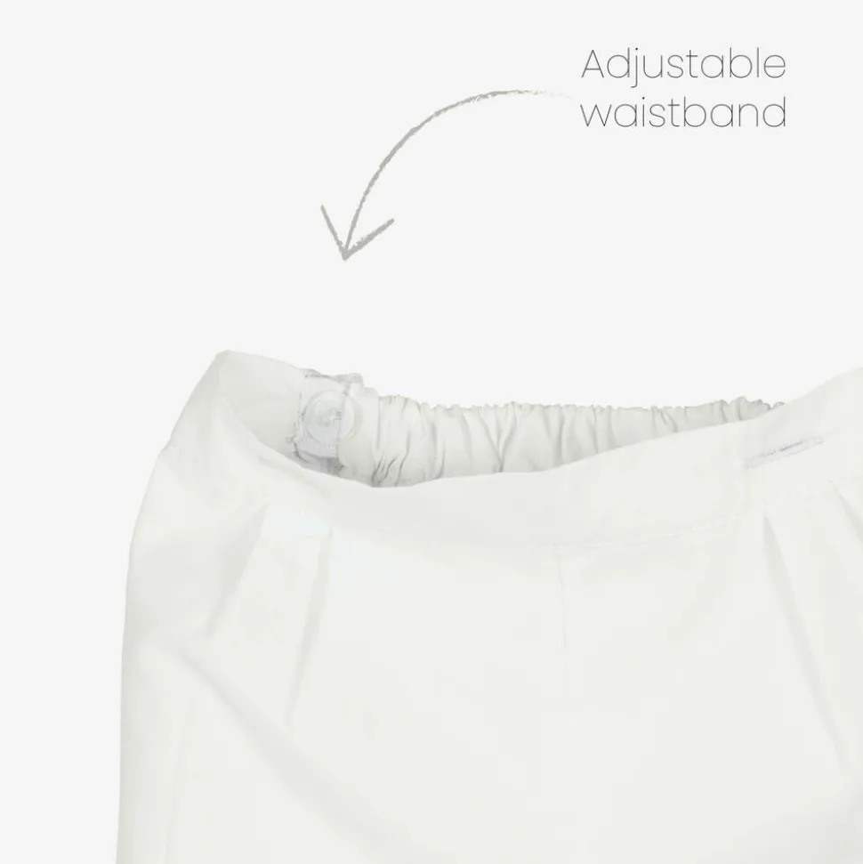 Smart and traditional, an ivory cotton-blend shorts set for little boys by Sarah Louise, made in lightweight poplin. The shirt has beautiful, hand-embroidered pin-tuck detailing, whilst the lined shorts have an adjustable, semi-elasticated waist for a great fit. The shirt buttons onto the shorts, keeping boys neat and tidy.
