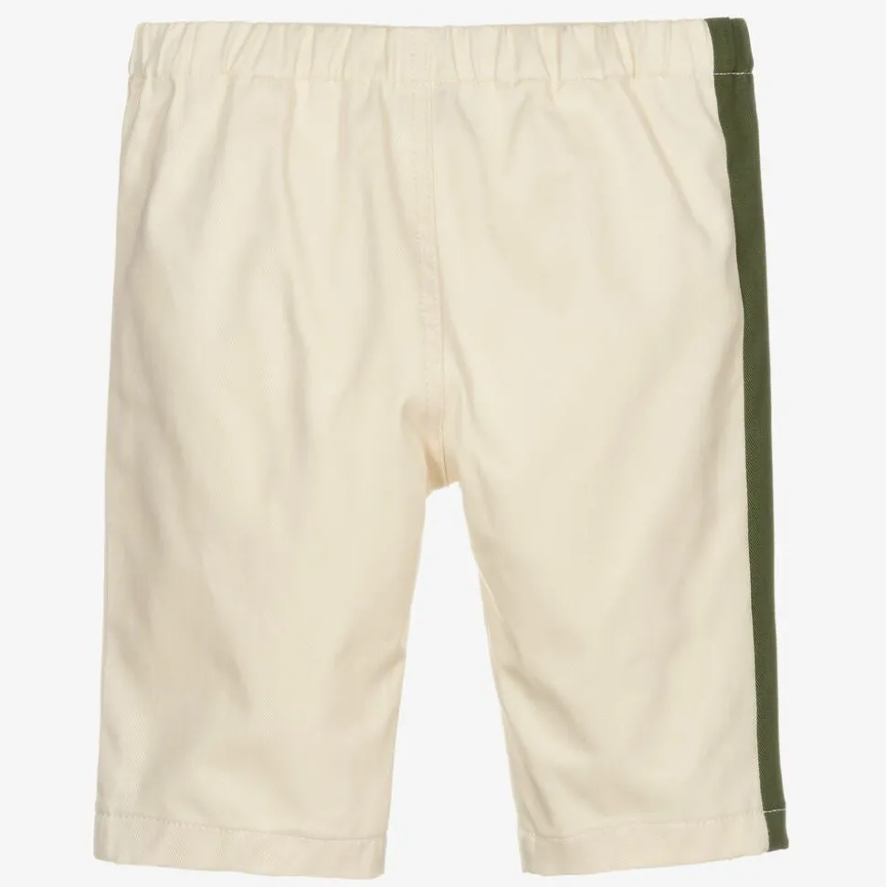 Ivory trousers for little boys by luxury Italian designer Gucci, made in soft mid-weight cotton gabardine. They are trimmed with an ivory, blue and red Sylvie Web Interlocking GG logo badge. There is red and navy blue trim on one leg, along with a single button fastening and elasticated waistband.