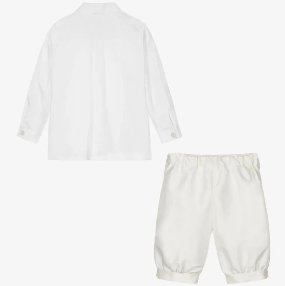 Traditional knickerbocker shorts set for boys by British brand Beatrice & George, exclusive to Childrensalon. Ideal for a special occasion, the white cotton shirt has a detachable, silky pale ivory slub dupion bow tie, with matching piping on the placket and logo button fastenings. The coordinating pale ivory knickerbockers have smart pleats on the front and button-fastening cuffs. They are fully lined for comfort and have a useful adjustable waistband that fastens with buttons on the sides.