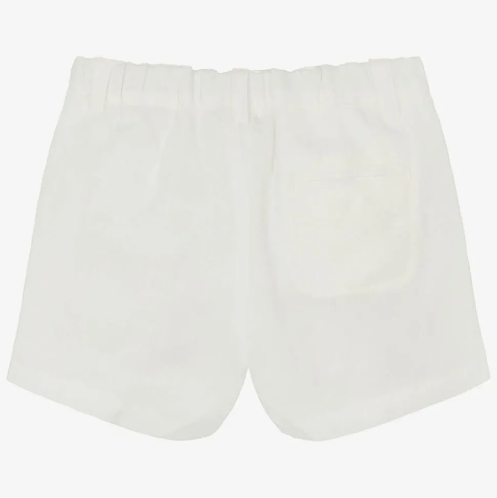 Smart ivory shorts for little boys, by French designer Bonpoint. Woven in luxuriously soft and lightweight linen, these tailored shorts have large front pockets, and the natural beige button and zip fastening ensures all-day comfort and style.