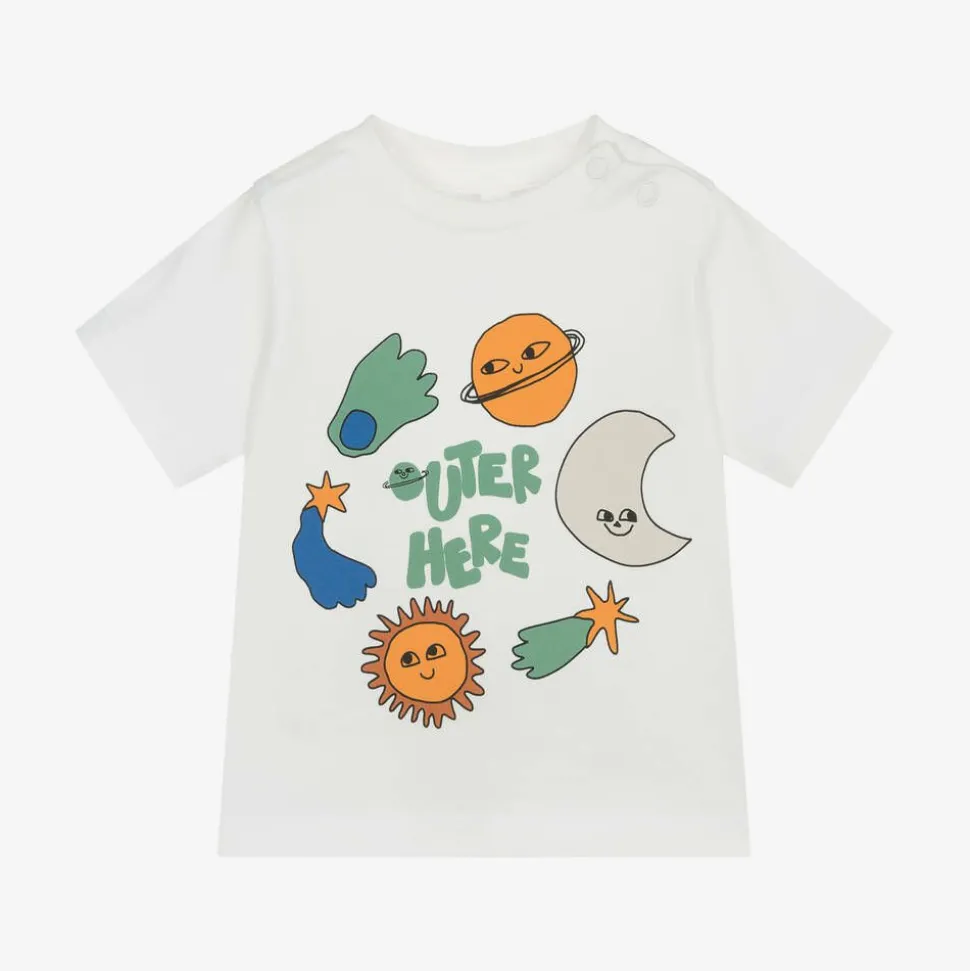Ivory T-shirt for little boys by Stella McCartney Kids, made in soft organic cotton jersey. Fun and playful, this short-sleeved tee has a space-themed print on the front with cosmic characters and an 'Outer Here' slogan. Popper fastenings on one shoulder help with dressing. The Stella McCartney fit can be quite small so choose a size up if you want room to grow.