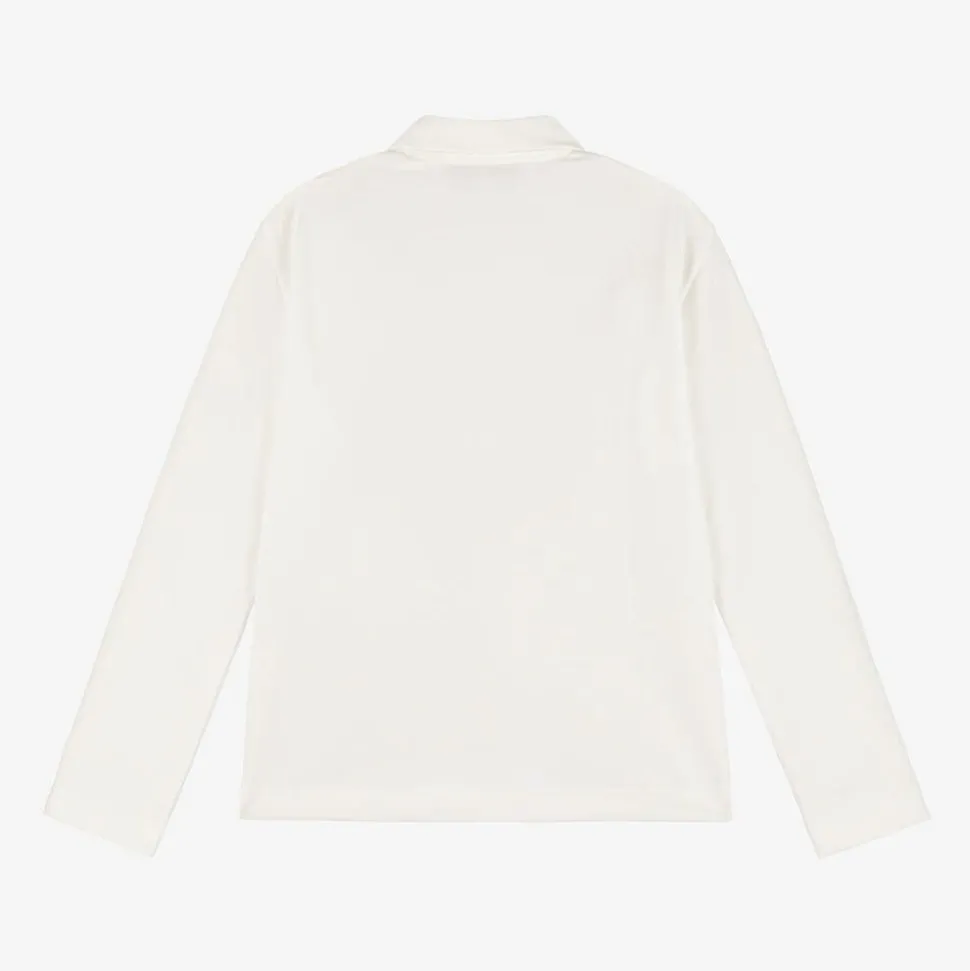 Ivory long-sleeved polo shirt for boys by luxury Italian label Roberto Cavalli, made in soft cotton piqué. Instantly recognisable, this classic top has an embroidered grey RC Monogram logo on the chest, together with a smart logo patch. It has a pointed collar and branded button fastenings to complete the look.