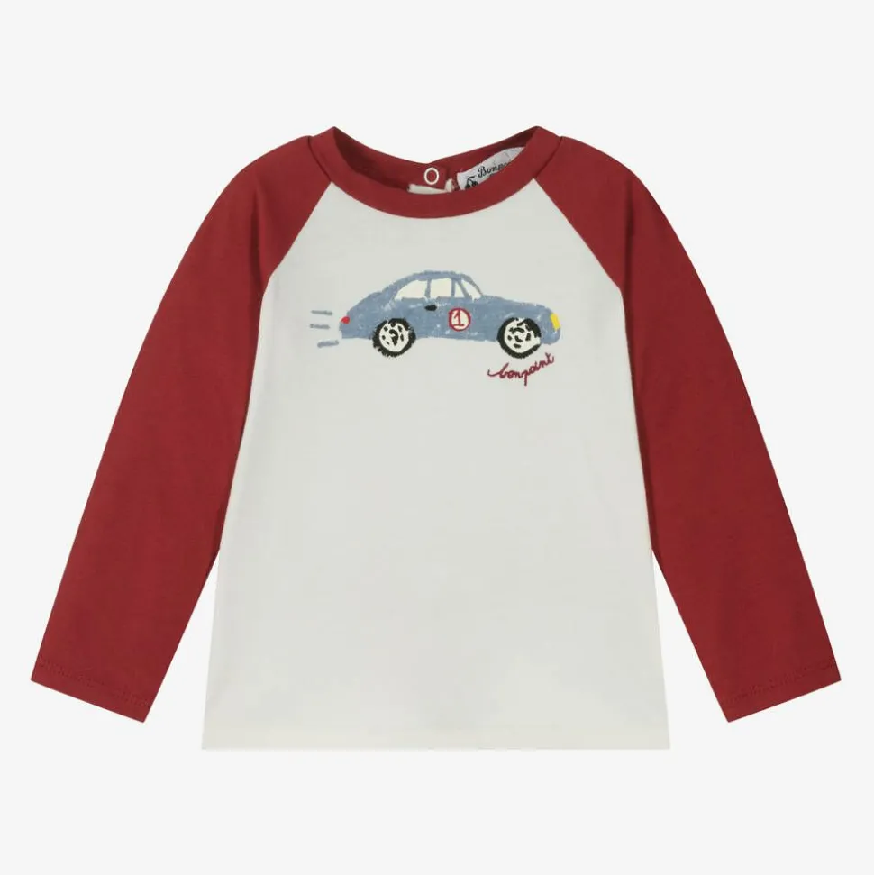 Ivory long-sleeved top for little boys by French brand Bonpoint, made in soft cotton jersey. Casual and comfortable, it has burgundy red raglan sleeves and a lightly ribbed crew neckline. There is a fun race car motif and red logo embroidery on the front, with easy to use popper fastenings on the back.