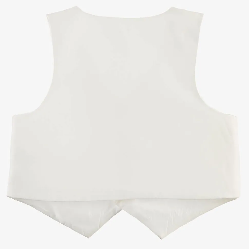 Boys ivory special occasion tuxedo suit by Romano. This elegant suit comprises a jacket, elasticated waist trousers, pintuck shirt, bow tie and waistcoat. The jacket has satin lapels, pockets and covered buttons. The trousers fasten with a button and have an elasticated waistband, with satin stripes down each side.