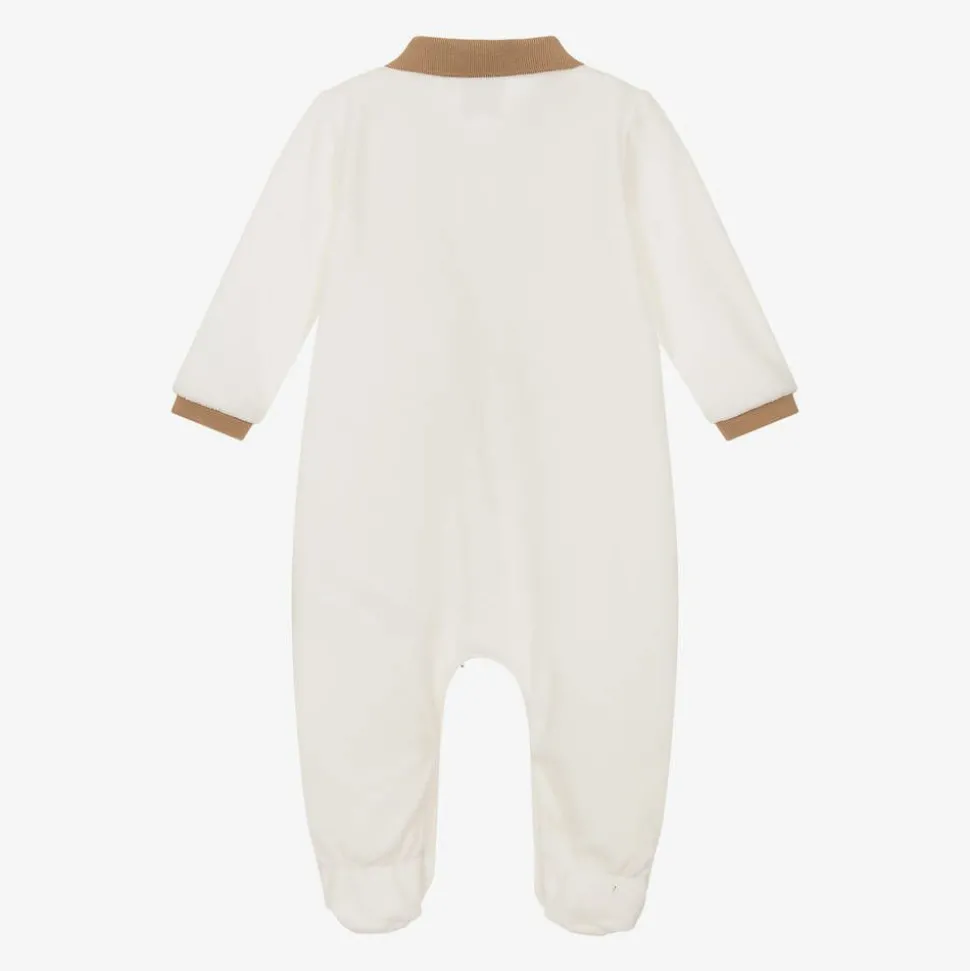 Presented in a branded box, this ivory babygrow for boys by BOSS, is made in wonderfully soft organic cotton velour. A lovely gift for a new arrival, this cosy one-piece has the brand's distinctive logo embroidered on the chest in black. The collar and cuffs are in contrasting beige and there are popper fastenings on the front concealed beneath a signature striped trim. Further poppers between the legs help with quick and easy dressing.