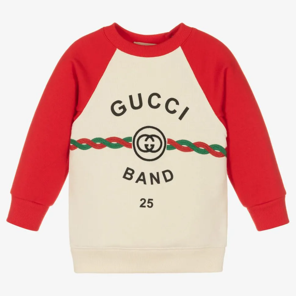 From luxury brand Gucci, an ivory cotton sweatshirt for little boys. It is crafted in soft, medium-weight jersey with red raglan sleeves and softly ribbed trims. This casual design is enhanced by the Italian label's black logo print, with 'Band' lettering, an embroidered Interlocking G motif, and torchon detail in the iconic red and green Web. It fastens easily on the back with concealed poppers.