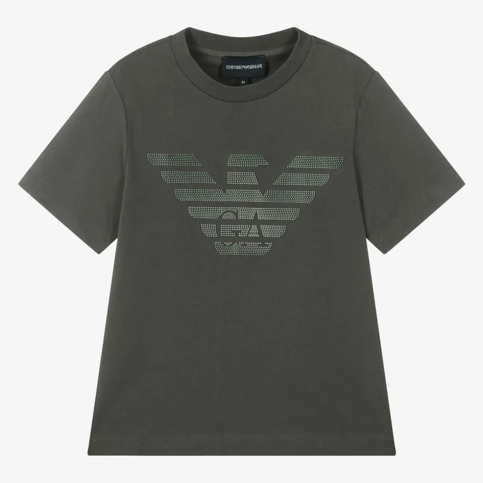 Dark khaki green cotton T-shirt for boys by iconic Italian brand Emporio Armani. For instant brand recognition, it has a rubberised 3D Eagle logo on the front. Super comfortable, it is made in soft, stretchy jersey and has short sleeves.