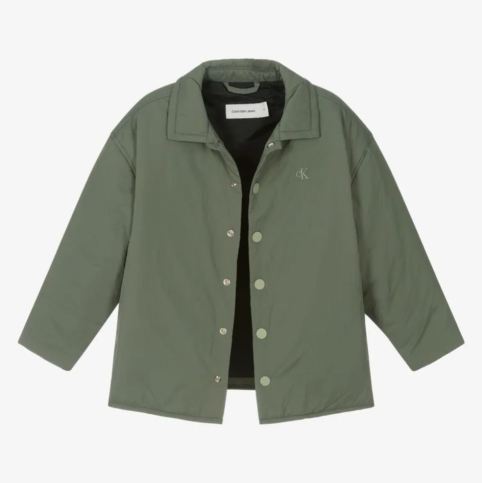 Khaki green jacket for boys by Calvin Klein, made in lightweight silky fabric and gently padded. It has contrasting green popper fastenings down the front and useful side seam pockets. An embroidered CK monogram on the chest adds a signature finish.
