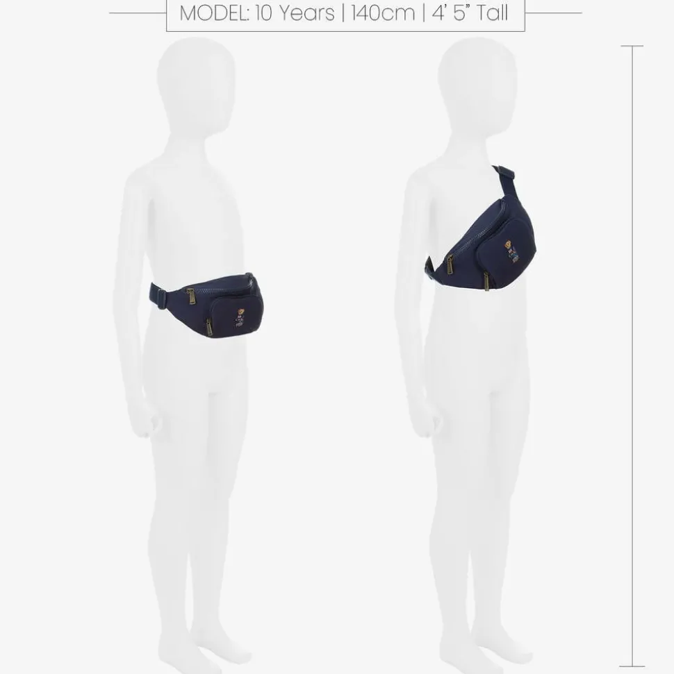 From Ralph Lauren, a navy blue cotton belt bag for boys with an embroidered Polo Bear on the front. With two zip fastening compartments for convenience, this useful bag has adjustable straps for a secure and comfortable fit.