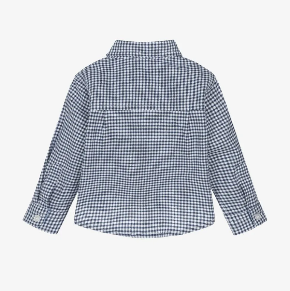 Navy blue and white check shirt for younger boys by Dr. Kid, made in soft cotton. Lovely for both smart and casual occasions, this long-sleeved shirt has pale blue Oxford cotton trims on the inside of the pointed collar and cuffs. It fastens neatly with pearlescent buttons and for designer appeal, has the brand's logo embroidered on the chest.