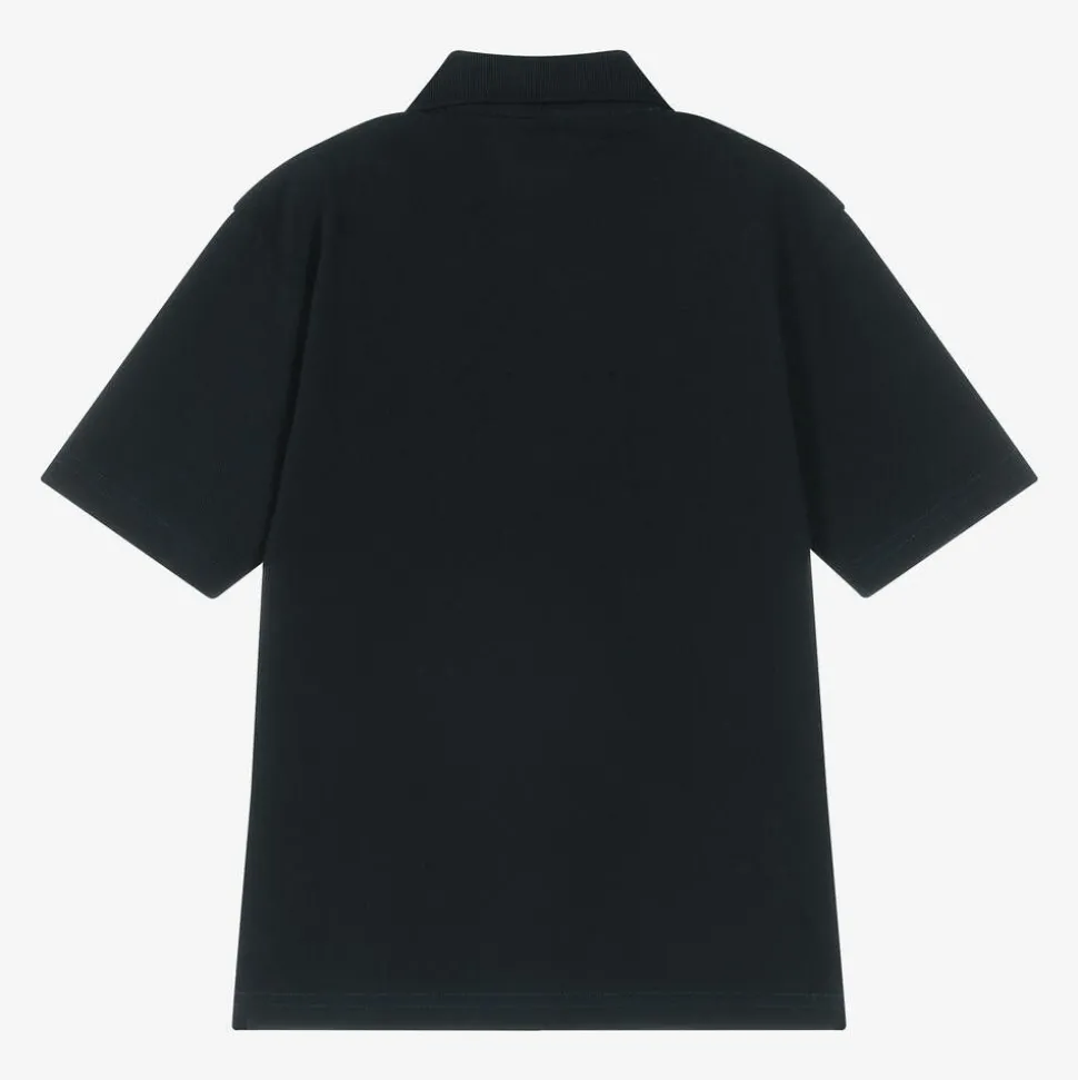 Navy blue short-sleeved polo shirt for boys by American brand Timberland, with the signature tree logo printed on the front in yellow. Made in comfortable, cotton piqué, it has a ribbed collar, branded button fastenings on the placket, and vented side seams.