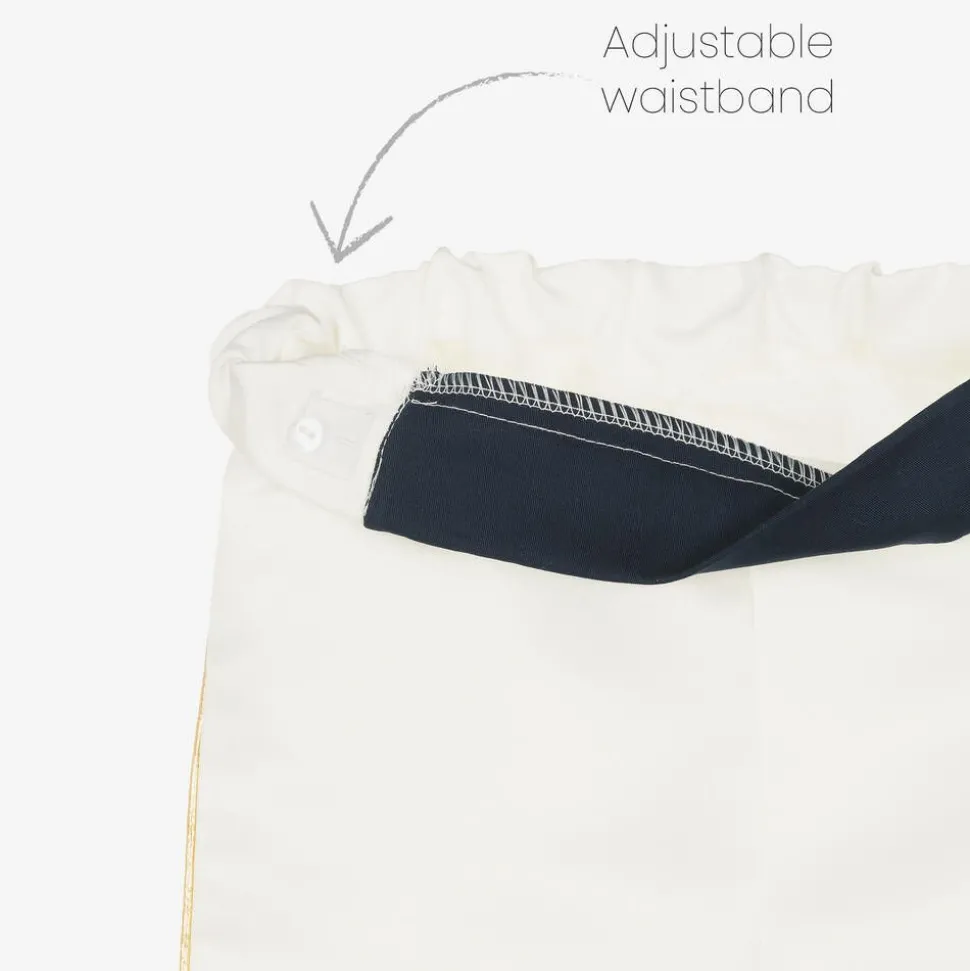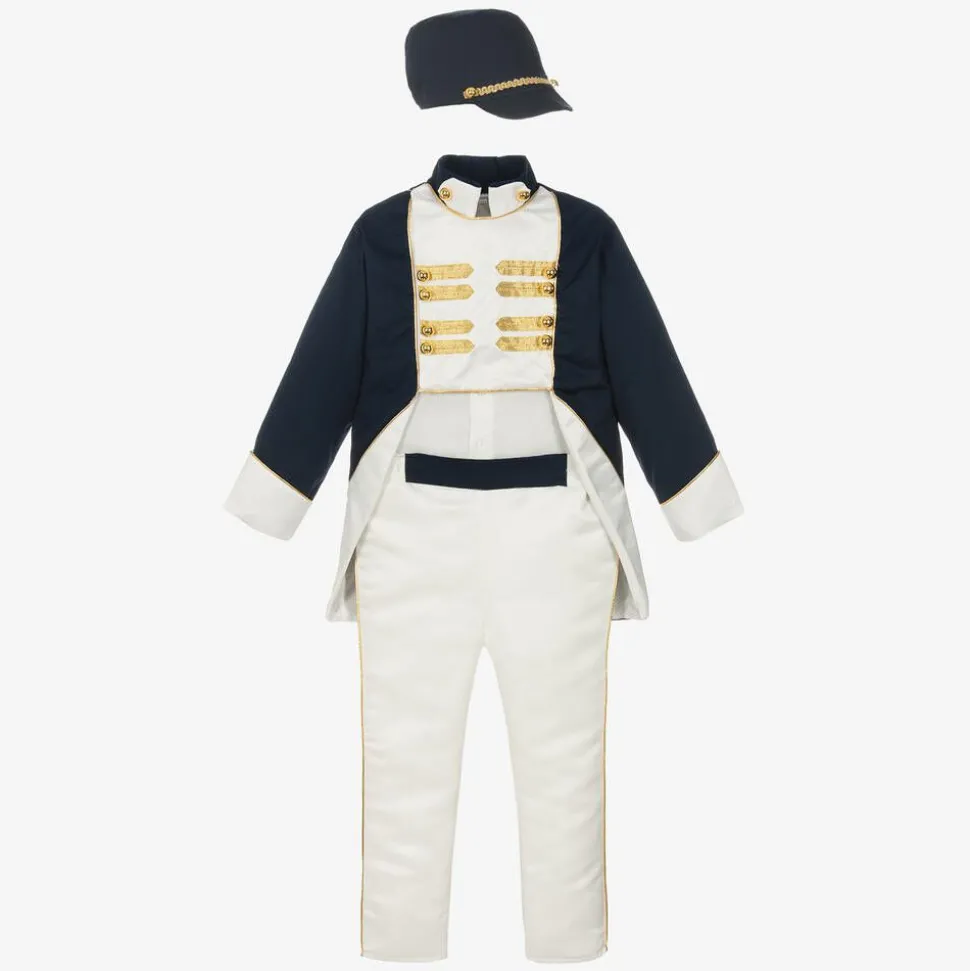 Ideal for special occasions, a navy blue and white military-style suit for younger boys by Andreeatex. With a lightweight lining, the long-line jacket has ornate gold trims, decorative gold buttons and a stand-up collar. It fastens with concealed buttons and popper on the front. The white satin trousers are lined in soft cotton and have an adjustable, elasticated waistband. There is a gold trim down each leg and a blue panel on the front for a coordinated look. A classically styled long-sleeved shirt, along with a matching blue hat completes this smart outfit.