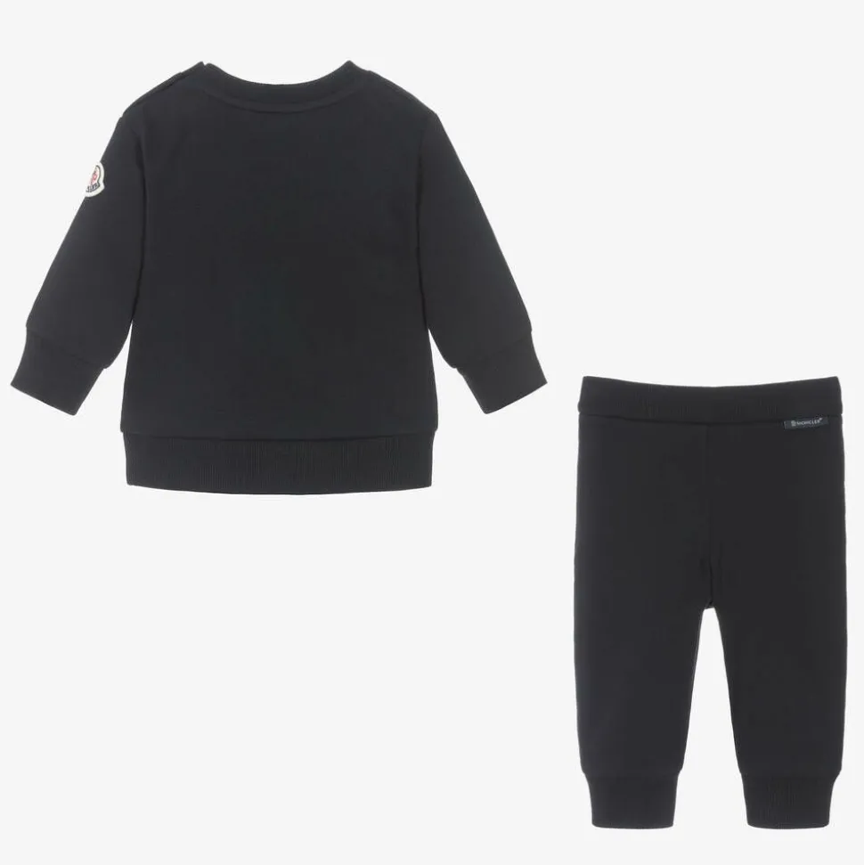 Casual navy blue cotton tracksuit for little boys by luxury brand Moncler Enfant. It is made in soft jersey with a cosy fleecy inside and ribbed trims. The sweatshirt features a tricolour logo print across the front and the designer's iconic patch on one sleeve for a signature look. It fastens with easy poppers on one shoulder. The joggers have a comfortable elasticated waist, trimmed with a small logo tab on the back.