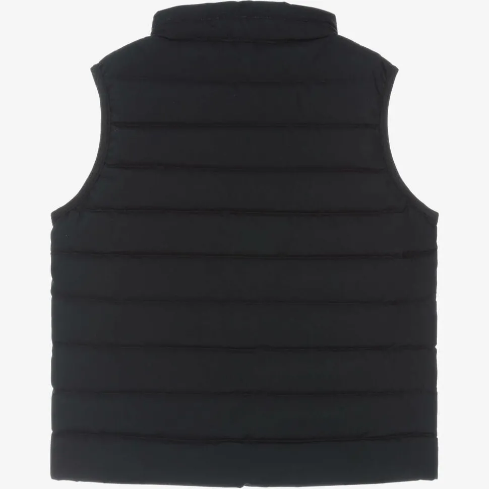 Navy blue gilet for boys from luxury Italian brand Emporio Armani, lightly padded with recycled down. Ideal for layering, this sleek outerwear piece has a branded zip fastening and the designer's Eagle logo patch on the chest. The gilet has a stand-up collar for extra protection and useful popper fastening pockets.